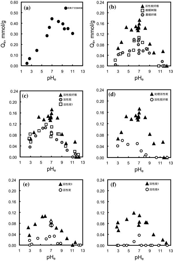 活性炭的陰離子吸附能力通常受溶液pH值的影響。因此,我們使用吸附實驗數(shù)據(jù)評估了所有pH范圍內(nèi)砷的潛在吸附位點。pH2-12吸附容量的結(jié)果如圖1所示。所有樣品在pH7附近表現(xiàn)出高吸附能力。通常,酸性pH條件下的陰離子吸附能力取決于堿性官能團的數(shù)量。作為基本官能團的例子,石墨烯層上的π電子可以吸引一些質(zhì)子,導(dǎo)致吸附位點略有增加。此外,吡啶氮(N-6)、吡咯氮(N-5)和胺基團在低于特定pH值時會變成帶正電荷的吸附位點,這取決于它們的酸度系數(shù),而季氮始終以帶正電的形式存在。因此,當(dāng)這些位點根據(jù)它們的酸度系數(shù)在某些酸性pH范圍內(nèi)變成正電荷時,它們可以充當(dāng)陰離子吸附位點。由于這個原因,碳的活化在酸性pH值而不是堿性pH值條件下表現(xiàn)出相對較高的砷吸附能力。然而,H3AsO4的酸度系數(shù)值為2.19、6.94和11.5。例如,砷酸鹽的主要種類是H3AsO4和H2AsO4-在pH值2.19。因此,當(dāng)溶液pH值低于2時,砷的主要種類變?yōu)橹行浴;钚蕴亢捅晃轿镏g的靜電相互作用變得排斥。此外,由于用鹽酸調(diào)節(jié)pH,砷酸鹽和氯離子之間的競爭會抑制砷酸鹽的吸附。相反,砷的主要種類是堿性pH范圍內(nèi)的陰離子。然而,當(dāng)溶液的堿度大于每個樣品的pHpzc時,碳表面帶負(fù)電荷。這些強堿性條件在靜電上不適合陰離子吸附。此外,過量的氫氧根離子也在堿性區(qū)域中充當(dāng)強競爭離子。綜上所述,陰離子吸附在堿性pH范圍內(nèi)是不利的。