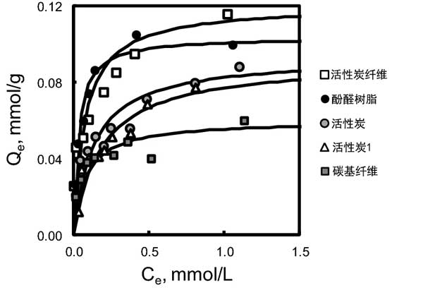 我們在圖2中顯示了連續(xù)加熱處理活性炭的朗繆爾吸附等溫線。由于顯示出大吸附容量的pH值較窄,因此我們將平衡pH條件確定為pH6.6-7.0。在此范圍內(nèi),大多數(shù)經(jīng)CVD處理的樣品顯示出穩(wěn)定的吸附能力。決定系數(shù)指出朗繆爾等溫線與所有樣品的合適匹配。因此,該結(jié)果表明砷吸附可以發(fā)生在單層上。總之,該結(jié)果支持了砷酸鹽吸附發(fā)生在NQ位點、石墨烯層上的π電子質(zhì)子化以及活性炭的含氧和氮的基本官能團質(zhì)子化的想法。