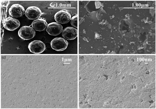 SEM被用于研究活性炭的形態、表面粗糙度和粒度。其內部孔隙結構信息也可以通過橫截面的SEM進行分析。SEM圖像顯示球型活性炭具有均勻的球形,粒徑(直徑)約為600μm(圖1a)。表面比較光滑,有較大的裂紋和孔隙結構,表面有許多無序的微晶結構(圖1b)。橫截面顯示了一些分布均勻的相對均勻的孔隙(圖1c和1d)。