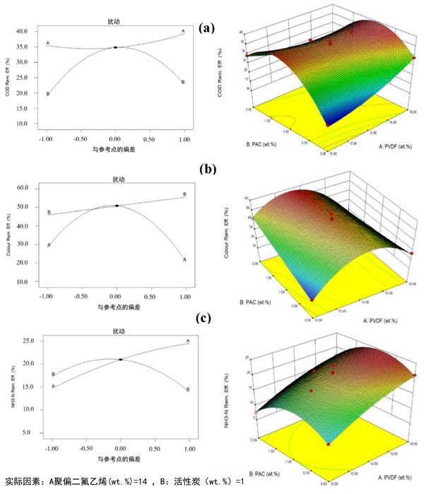 圖3:活性炭與聚偏二氟乙烯制造的膜的擾動圖(左)和3D響應面(右)用于去除(a)COD、(b)顏色和(c)NH3-N的效率。