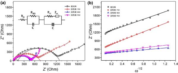 圖2:a電化學阻抗譜,b是阻抗與炭化料和活性炭角頻率平方根倒數之間的線性關系。