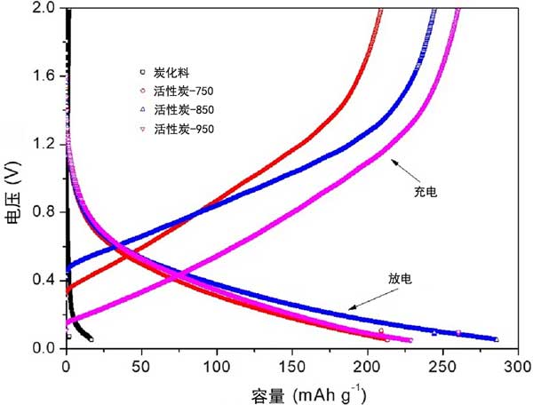 充放電曲線評估了活性炭的的電化學性能,不同溫度活化的活性炭電極如圖3所示。CD測試是在0.25C的電流密度速率下進行的。活化溫度提高了充電容量。活性炭樣品的高充電容量為260.36mAh/g-1,而炭化料樣品的低充電容量為1.98mAh/g-1。這是因為活化的樣品可以吸收很多的鋰離子。放電曲線顯示三個不同的電位區域,這可能歸因于不同的機制。0到0.12V的區域對應于鋰離子從隨機取向的小分子堆疊中的微孔中脫出。0.12到0.8V的區域歸因于鋰離子從無序石墨烯層中脫出。高于0.8V的區域對應于鋰從各種邊緣位置或石墨烯層中含H-/O官能團的脫嵌。