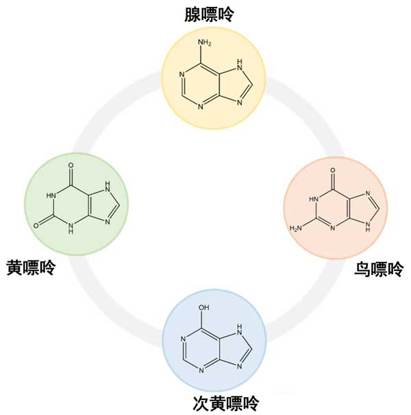 嘌呤化合物在所有生物體中都至關(guān)重要。嘌呤,其是指取代的嘌呤和各自的互變異構(gòu)體,如示于通過嘧啶的融合和咪唑環(huán)形成的,雜環(huán)芳香化合物(圖1)。這類化合物包括堿基、核苷和核苷酸,一些例子是腺嘌呤、鳥嘌呤、次黃嘌呤和黃嘌呤(圖2)在哺乳動物中,嘌呤更常見地表達(dá)為核酸,例如核糖核酸和脫氧核糖核酸(分別為RNA和DNA),它們包含兩個嘌呤堿基腺嘌呤和鳥嘌呤,以及幾種單分子核苷酸,如ATP、ADP、單磷酸腺苷(AMP)和環(huán)磷酸腺苷(cAMP),以及在較小程度上,鳥苷三磷酸(GTP)和環(huán)磷酸鳥苷(cGMP)。