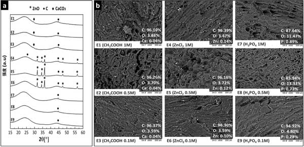 活性炭的X射線衍射圖如圖1-a所示。峰值在2θ=44在所有衍射圖中觀察到的6°歸因于對應(yīng)于石墨(00-001-0646)的(101)平面。與其他材料不同,活性炭的衍射圖也顯示在2θ=26.4°歸因于石墨(00-001-0646)的(002)平面。ZnO和CaCO3可能是在熱處理過程中作為原材料組分和活化劑之間二次化學(xué)反應(yīng)的產(chǎn)物或由于前體中固有的殘留礦物質(zhì)含量而產(chǎn)生的。經(jīng)過掃描電鏡分析500倍的SEM顯微照片如圖1-b所示。觀察到所有活性炭都表現(xiàn)出異質(zhì)表面形態(tài),其由不規(guī)則形式的成組薄片組成。在用ZnCl2活化的碳的表面上觀察到與氧化鋅相對應(yīng)的沒有特定形狀的白色小顆粒(通過XRPD分析證實(shí))。此外,EDS分析顯示存在分散在整個(gè)表面的碳(C)、氧(O)和鋅(Zn),從而證實(shí)了ZnO顆粒分散在這些吸附劑的表面上。