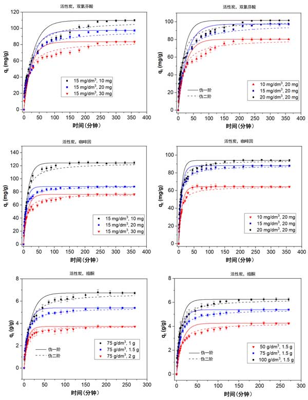 圖1:使用不同吸收濃度和活性炭用量對活性炭上雙氯芬酸、咖啡因和縮酮的動力學吸附數據。