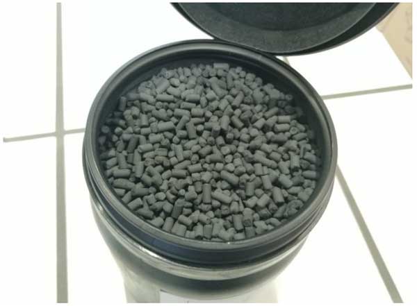 根據(jù)直接使用瓶裝真實(shí)氣體所獲得的結(jié)果,包括列出的催化劑毒物,這會(huì)導(dǎo)致催化劑快速降解,因此在第一個(gè)反應(yīng)器的上游安裝了活性炭過(guò)濾器。為此,將金屬氧化物浸漬的活性炭顆粒添加到氣體混合站。這些顆粒專(zhuān)門(mén)開(kāi)發(fā)用于從缺氧氣流(例如CO2、N2、CO和H2)中去除硫化氫、有機(jī)硫醇、二氧化硫、硫化羰和氮氧化物。它們的銅含量為7%(以CuO計(jì)),直徑為3mm,長(zhǎng)度為7mm(圖3)。將總共約300毫升的這些顆粒活性炭加入氣體混合站。