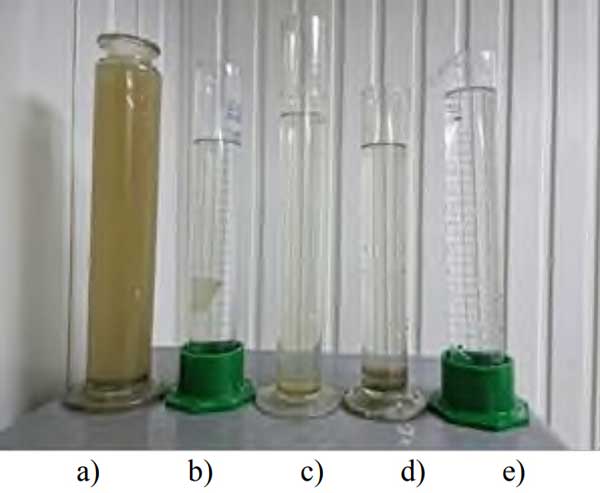 圖3:廢水處理效率,a-原始廢水,b-木質活性炭,c-椰殼活性炭,d-果殼活性炭,e-煤質活性炭。
