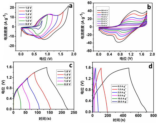 圖2:(a)活性炭/氧化鎳電容器的CV曲線的掃描速率檢查,(b)活性炭/氧化鎳電容器在不同的掃描速率下的CV曲線,(c)活性炭在1Ag-1電流密度下在不同截止范圍測(cè)量的GCD曲線,和(d)活性炭在不同電流密度下的GCD曲線。