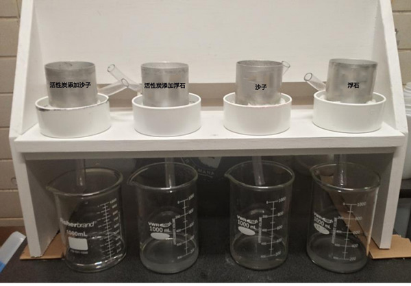 酸二氫鉀在去離子水中制備磷溶液,將活性炭稱重到試管中,,并用36mL的16.3mg/L-1正磷酸鹽平衡,僅包括沙子或浮石樣品。將管在端到端振蕩器上以90min-1的頻率平衡24小時,并通過0.2-μm膜過濾器過濾上清液。根據鉬酸鹽法,使用UV-VIS分光光度計分析濾液中的正磷酸鹽。總共16根柱子(直徑7.62厘米,高7.62厘米)用沙子或浮石填充到4.56厘米的深度(圖2)。十六列對應于由兩種過濾器(沙子或浮石)和四種活性炭改進材料組成的實驗,包括對照(無添加活性炭),一式兩份。將含活性炭改良劑和不含活性炭改良劑(按重量計5%)的沙子或浮石混合,然后將其干填充到柱中。每個柱子的底部都用粗棉布保護,這樣可以大限度地減少過濾材料的損失。