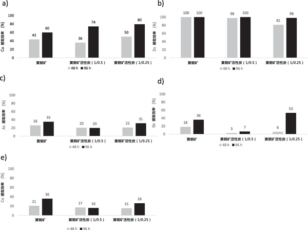 使用帶有攪拌的恒溫浴用于浸出測試,該測試在90℃和250rpm下在250mL硼硅酸鹽玻璃罐中使用H2SO4溶液(在pH值1)濃度為5gL-1的Fe(III)。在浸出過程中控制溫度(90℃)和攪拌速度(250rpm),直到48和96小時。浸出劑溶液的Eh為547mV。硫酸的純度和硫酸鐵(III)分別為97%和99.5%。在每個實驗中,在硼硅酸鹽玻璃罐中稱量2.5g。除對照外,活性炭比為1/0.5和1/0.25。然后,加入50mL浸出劑。使用兩個反應時間對每種活性炭混合物進行兩次浸出實驗:第一次直到48小時,第二次直到96小時。在浸出實驗期間,每24小時打開一次罐子,以確保浸出系統有足夠的氧合。在反應結束時(48小時和96小時),將紙漿過濾并用50mL/H2SO4洗滌兩次pH2的溶液以回收吸附在活性炭表面上的金屬。通過測定浸出和洗滌溶液中的Cu、Zn、As、Co和Sb的含量。