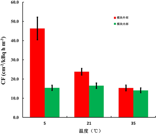 對于實驗,使用三種活性炭的織物為探測器設計了單獨的模塊。對于前兩種活性炭,模塊是HDPE,對于第三種活性炭,模塊是LDPE。單獨設計遵循上述方法,考慮到每種活性炭織物的確切單獨質量。在所有設計中,不同溫度下的k(T)值根據方程式計算。活性炭的結果如圖2所示。5℃時的CF0比35℃時的CF0高305%。相比之下,對于放置在補償模塊中的傳感器,CF的變化在17%以內(最大值/最小值=1.17)。值得注意的是,在模塊內部不同溫度下暴露的傳感器的CF之間的配差異在95%的顯著性水平上沒有統計學意義。發現所描述的帶有補償模塊的探測器的CF明顯高于其他常用的無源氡探測器。