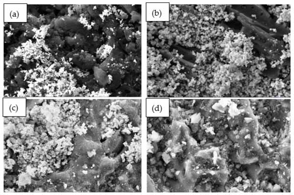 圖1:活性炭雙金屬浸漬吸附劑的SEM形態圖像,比例放大2.5Kx(2μm)。(a)ZnAc2/ZnO/活性炭,(b)ZnAc2/KOH/活性炭,(c)ZnAc2/TiO2/活性炭,(d)ZnAc2/活性炭。