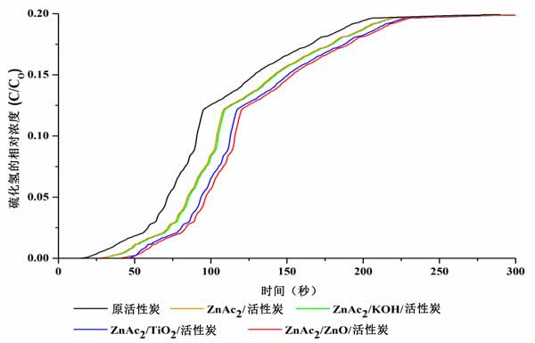 通過選擇合成吸附劑對硫化氫氣體的吸附效果產生了如圖3所示的吸附曲線。這些吸附曲線也與使用浸漬活性炭和原活性炭實現的吸附進行了比較。我們發現吸附趨勢呈指數增長,形成S曲線。突破時間被確定為硫化氫濃度達到1ppm(突破濃度)和飽和濃度達到幾乎5000ppm的值所用的時間。與其他雙金屬活性炭吸附劑相比,ZnAc2/ZnO/活性炭吸附劑的吸附表現出優異的性能。雙金屬活性炭吸附劑的合成表現出良好的性能,與ZnAc2/活性炭和原活性炭相比,硫化氫的吸附增加了30.2-45.8%和85.9-89.1%。因此,采用這種浸漬方法的活性炭表現出的高吸附增強了硫化氫吸附能力。