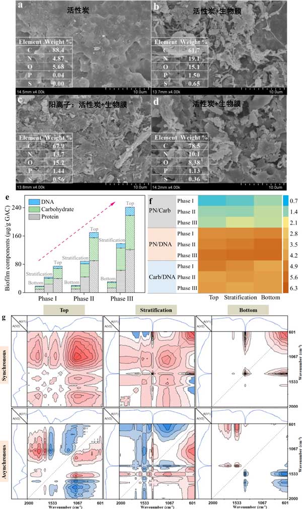 活性炭是生物膜生長的優良載體,它可以快速從液相中吸收有機物和營養物質,用于生物膜中微生物的新陳代謝。圖1顯示了有和沒有生物膜的活性炭形態動力學、生物膜組分的濃度和反應器不同位置的官能團;钚蕴恐械脑刂饕ㄌ(C,88.4%)、氮(N,4.87%)、氧(O,5.68%),以及少量的磷(P,0.04%),活性炭表面為比較順利。生物膜形成后,活性炭表面附著大量生物質,變得更加粗糙。由于生物膜中蛋白質、碳水化合物和DNA的積累,包括N、O和P在內的主要元素的比例顯著增加(圖1e)。值得注意的是,硫元素也被檢測到,這應該有助于活性炭和生物膜對LAS(磺酸基團)的吸附。