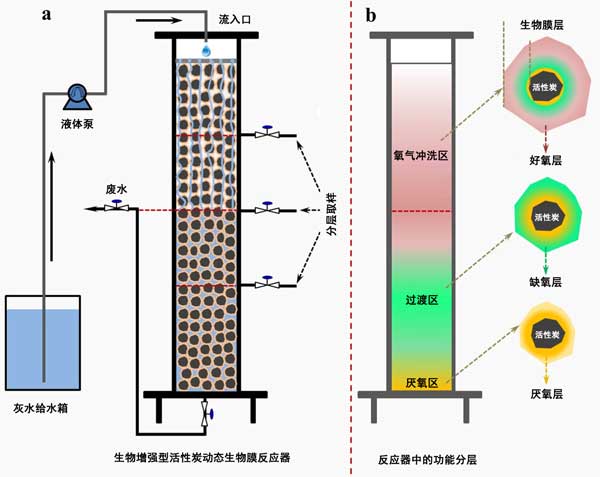 圖2:a活性炭動態生物膜反應器示意圖和b灰水期間活性炭反應器中的功能區和生物膜層在顯著分層位置處理。