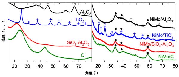 活性炭載體的X射線衍射圖在圖1顯示。高表面積TiO2特別是銳鈦礦,而其他載體實際上是X射線無定形的。Al2O3表現出其γ相的典型寬峰;钚蕴看呋瘎┲苽浜,X射線圖案在約33.5(肩峰高達約38)和58.5度處顯示出典型的寬而低強度峰,這表明所有催化劑中都存在NiMo硫化物的X射線非晶相。最近,將德拜函數分析(DFA)應用于XRD數據和高分辨率透射電子顯微鏡(HRTEM)的組合解釋了這些寬而低強度的峰如何可以通過MoS2納米微晶的存在來解釋。大約38度的較大肩部被指定為存在多層,因此存在較大的MoS2納米微晶。然而,應該注意的是,銳鈦礦相也可以解釋TiO2負載催化劑中的肩峰。對于其他催化劑,與大約33.5度處的第一個峰的強度相比,該肩峰不太明顯。