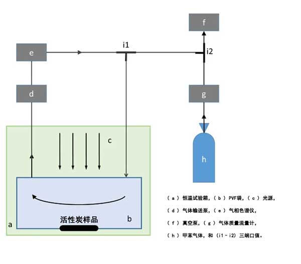 系統研究了活性炭復合材料的光催化性能。為了模擬實際應用,在恒溫試驗箱中將不銹鋼罐替換為60L聚氟乙烯袋,并保持恒溫(例如20℃)。然后,將3g活性炭微粒放在盤子上并放入袋中。入射光可以穿過PVF薄膜到達活性炭表面。其結構如圖1所示。為了測試光催化活性,反應器首先用泵抽真空。然后,注入60L甲苯氣體(空氣中50.0ppm)作為目標室內污染物。這需要大約12分鐘。之后,將反應器在黑暗中保持0.5小時以達到吸附/脫附平衡。使用300W氙氣燈作為模擬日光源。使用氣相色譜儀定期分析反應器中的氣體產物。此外,口袋中的甲苯氣體還不能完全流到氣相色譜儀的自動氣體進樣閥,因為該閥的管徑比較小,輸氣泵剛剛啟動。因此,甲苯濃度低。