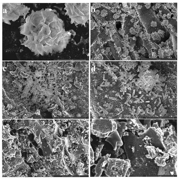 圖2:(a-d)不同含量負載的活性炭復合材料和活性炭(e-f)的SEM圖像。