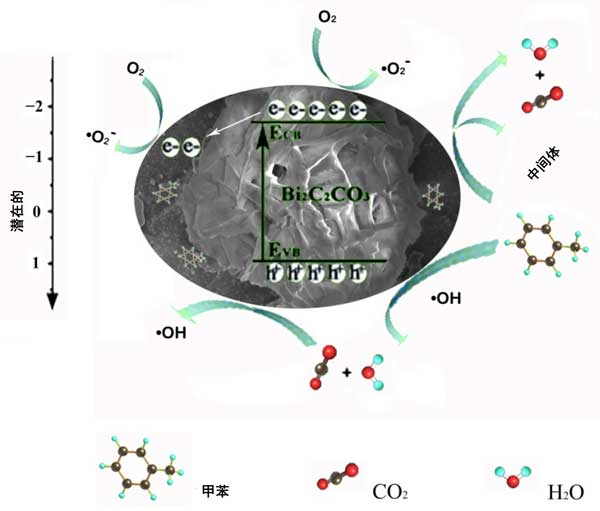 活性炭復合材料在光照射下降解氣態甲苯的光催化反應機制可以解釋如下(圖4)。首先,蜂窩狀活性炭基質吸附并捕獲甲苯分子。然后,在光照下,電子從價帶(VB)激發到負載Bi2O2CO3的活性炭表面的導帶(CB),在VB中留下空穴;钚蕴靠梢猿洚旊娮邮荏w以降低電子-空穴對的復合率。因此,Bi2O2CO3中CB上的激發電子可以很容易地轉移到活性炭表面,從而促進光生電荷載流子的分離和遷移。