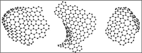 圖1:彎曲片段的示意圖,包含五邊形和七邊形環以及六邊形。