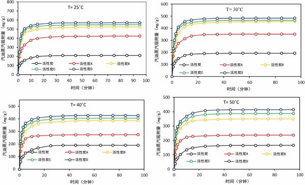 經過進一步研究,發現活性炭D樣品比其他樣品更能增強汽油蒸汽吸附,這表明表面結構在捕獲分子方面的重要性和關鍵作用,正如預期的增強吸附一樣。事實上,與其他合成樣品相比,活性炭樣品具有更高的表面積和豐富的微介孔,可以顯著提高吸附量圖2。我們還研究了活性炭用量對吸附容量的影響。正如發現的那樣,隨著活性炭的用量增加,蒸汽吸附能力可以進一步提高,這可能是由于通過提高活性炭量,表面積和孔隙反而增加,進而可能有助于增強吸附。鑒于發現隨著活性炭用量比從1增加到4,汽油蒸氣吸附能力提高。