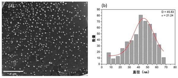 圖2:具有1微米比例尺的SEM圖像顯示納米粒子在活性炭上的均勻分布(a)以及通過對活性炭混合納米雜化材料的SEM直方圖進行高斯擬合獲得的尺寸分布(b)。