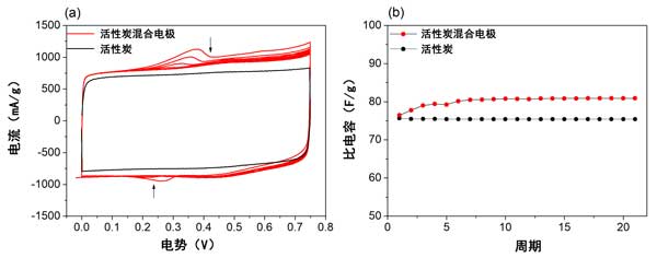 圖3:(a)使用1M/H2SO4電解質并以20mV/s收集的對稱紐扣電池中電極的CV曲線,箭頭表示CV循環數的增加。(b)比電容隨CV循環次數的變化。