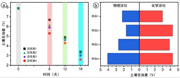 通過吸附實(shí)驗(yàn)研究了活性炭樣品在污染土壤修復(fù)中的潛在用途。對活性炭對汽油、煤油和柴油的吸附能力進(jìn)行了評估。在所有樣品中,活性炭1的吸附能力最高:汽油為9.3g/g,煤油為9.0g/g,柴油為10.1g/g。這些優(yōu)異的結(jié)果歸功于活性炭發(fā)達(dá)的微孔和中孔結(jié)構(gòu),氮吸附/解吸等溫線就是明證。相比之下,活性炭2的吸附能力中等,石油產(chǎn)品平均為7.0g/g,而其他的吸附能力較低,范圍為4.5至5.1g/g。所有樣品中柴油的吸附量均高于汽油和煤油,這可能是由于柴油的粘度較高,從而增強(qiáng)了其與碳表面的相互作用。為了在實(shí)際條件下驗(yàn)證結(jié)果,將活性炭引入受油污染的土壤中,并在處理后8至16天內(nèi)定期采集樣品,以使用重量法估算油含量。圖2a顯示了土壤樣品中的初始和后續(xù)油含量。