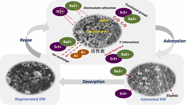 ‌電子云相互作用‌:XPS分析證實C=O(531.2eV)和C-O(533.6eV)官能團(tuán)作為主要吸附位點,通過π電子云轉(zhuǎn)移與金屬離子形成配位鍵,其中Ba²⁺的電子云極化率(1.74ų)顯著高于Sr²⁺(1.22ų)