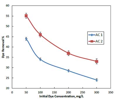 初始染料濃度在50〜300 mg L -1檸檬黃對(duì)AC1和AC2吸附效率的影響,結(jié)果如圖2所示。從圖中可以看出,隨著酒石黃初始濃度的增加,酒石黃脫除百分比降低。雖然吸附百分比隨初始染料濃度的增加而降低,但每單位質(zhì)量吸附劑吸附染料的實(shí)際量隨著試驗(yàn)溶液中染料濃度的增加而增加。為AC1的單元吸附從10.85增加MGG -1至35.70 MGG -1作為供試品溶液的酒石黃濃度從50 MGL增加-1至300 MGL -1。類似大號(hào) Y,對(duì)AC2單元吸附從14.05增加MGG -1至50.1 MGG -1作為染料濃度從50 MGL增加-1至300 MGL -1。