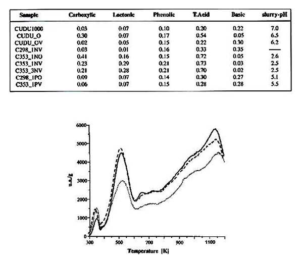 圖1顯示了過氧化氫處理后產生的活性炭的化學行為。從上面看出的氧化過程增加了活性炭的總酸度,并且與羧基和酚類基團的增加一致。此外,TPD曲線顯示了放出氣體的增量,峰值集中在與活性炭相同的溫度。低溫和高溫分解組的面積總體增加歸因于羧基-內酯類結構和后面的酚類基團。H2O2氧化碳的FT-IR光譜在1542和1190cm-1處顯示帶就像那些原始的碳,但后來的孔隙已經擴大,顯示出C-O伸展模式的增加。總之,這些研究表明僅在H的性質的小變化H2O2處理過的碳,即,是在氧化時,其類似于由其他研究人員報告的行為沒有觀察到變化顯著。其中過氧化氫溶液的氧化作用明顯地看作羧酸類基團的重要減少,伴隨著堿性基團的大量增加。