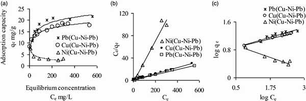 金屬離子作為路易斯酸的性質(zhì)可以證明金屬物質(zhì)與生命系統(tǒng)和活性炭吸附劑的相互作用。因此,通過其路易斯酸度對金屬進(jìn)行分類將在其修復(fù)方法中保持一致。這種類型的分類基于它們觀察到的對不同配體的親和力將金屬分為三類,如(a)類“硬金屬”,(b)類“軟金屬”或類(c)邊界“難以區(qū)分為硬或軟”。通過在含有Cu(II),Ni(II)和Pb(II)三元溶質(zhì)的溶液中的吸附,研究了邊界和軟陽離子之間的競爭效應(yīng)。圖2顯示了Cu(II),Ni(II)和Pb(II)的Langmuir(a和b)和Freundlich(c)吸附等溫線,而它們的初始濃度在三元溶液中從<25到≤600mgL變化-1和初始pH保持恒定在5.由于單個Cu(II)吸附是在不同的初始濃度<5至<120mg L-1下進(jìn)行的,并且通過制備的活性炭對初始濃度沒有發(fā)現(xiàn)可檢測的殘留濃度通過構(gòu)建圖1(a)和1(b)中提到的相同濃度范圍的Langmuir等溫線,研究了5mg L-1的競爭離子的影響。這些等溫線的模型參數(shù),對于Langmuir曲線擬合,r2值通常更高。
