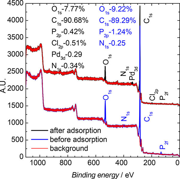 吸附過程之前和之后材料的完整XPS光譜如圖2所示。考慮到觀察到的溶液中Pd(II)濃度的降低,估計鈀負載等于0.7%(m/m)?梢钥闯鰜碜遭Z的峰出現。對這個峰值進行更深入的分析可以為我們提供有關鈀電子結構的信息。