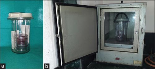 圖3:(a)然后將瓊脂平板置于氣體包裝罐中進行厭氧培養。(b)然后將氣體包裝罐置于培養箱中48小時。