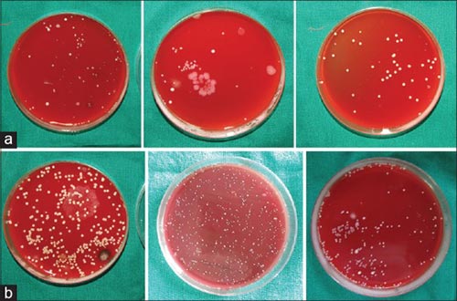 圖4:(a)厭氧培養48小時后活性炭刷毛的菌落形成單位。(b)厭氧培養48小時后的非炭鬃毛菌落形成單位。