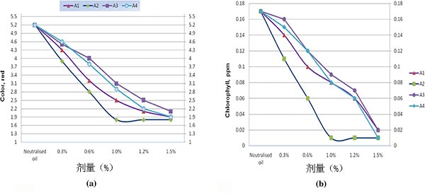 吸附劑的量是漂白過程中最重要的因素。圖3中所示的吸附劑用量的幾種活性炭和漂白土的效果。結果清楚地表明,活性炭樣品A2在1%吸附劑用量下達到最佳值,吸附劑用量的進一步增加對其沒有顯著影響。這可以通過吸附平衡在吸附劑/油混合物之間達到最大值的事實來解釋。然而,通過在漂白過程中增加其它吸附劑A1,A3和A4的數量來增加顏色吸收,并且1.5%地球樣品A4顯示與1%活性炭樣品A2相同的結果。圖3b顯示當使用漂白土和活性炭漂白葵花籽油時劑量對葉綠素減少的影響。該圖還表明吸附劑A2對顏色去除的影響比其它的更為有效。