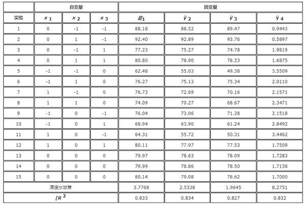 圖1示出了一組測定的實驗條件(表示為編碼變量)和因變量所獲得的實驗數據y1-y4,以及有關廢水的顏色化合物的參數,與活性炭處理前的參數。