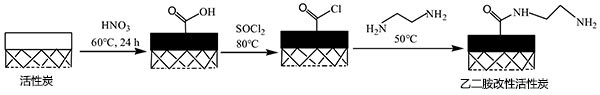 步驟一:乙二胺合成改性活性炭,用去離子水洗滌活性炭并干燥,得到10.0g活性炭,將其加入250mL含有150mL硝酸溶液的燒杯中。將反應混合物在60℃下攪拌24小時。然后用去離子水洗滌產物以中和并在105℃的真空烘箱中干燥以獲得經硝酸處理的活性炭。然后將2.0g處理后的活性炭和5mL SOCl 2加入燒瓶中。將反應混合物在80℃下加熱12小時。反應后,將混合物加熱至130℃以蒸發殘留的SOCl 2并冷卻至室溫(25℃)。將產物加入100mL DMF中,溶解5mL EDA并在50℃反應8小時。冷卻至室溫后,分別用去離子水,DMF和無水乙醇洗滌產物數次,然后在105℃的真空烘箱中干燥,得到改性活性炭。合成過程在圖1中說明。