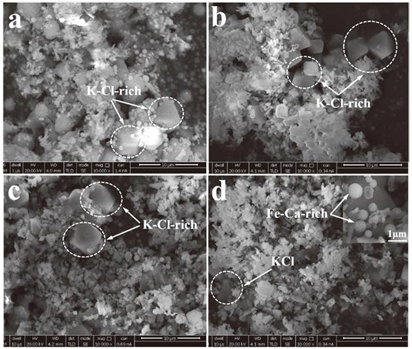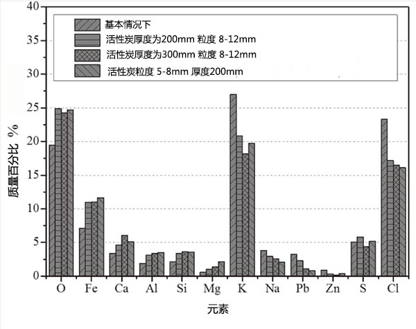 圖4顯示了煙氣通過活性炭之前和之后的化學組成。可以發現PM 2.5中的+ Fe,Ca,Si,Al和Mg的含量在煙氣通過活性床時比基礎情況下都有所增加,而K,Na,Pb的含量, PM 2.5中的 Zn和Cl都出現了下降。圖5給出了煙氣經過活性炭層后在過濾器中收集的PM 2.5的SEM圖像,觀察到經活性炭去除后,較大顆粒的數量主要由K和Cl組成減少(圖5)(b)-5(d))與基本情況比較(圖5(a))雖然有許多較小的顆粒,如球形顆粒(圖5(d)),主要包含Fe和Ca這種現象與PM 2.5的化學成分變化非常一致。此外,與使用厚度為200毫米,粒度為8-12毫米的活性炭床的情況相比(圖5(b)),出現了較少的大的富含K-Cl的顆粒,并且出現了許多較小的球形富含Fe-Ca的顆粒。