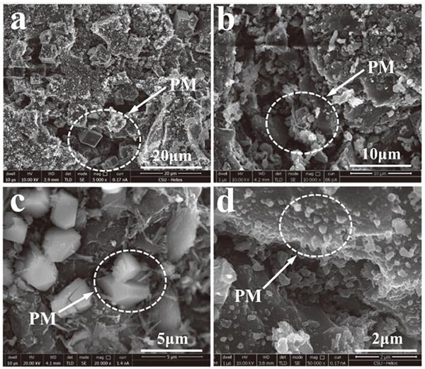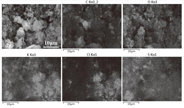 圖5顯示了粘附顆粒物質后活性炭的形態,其中可以發現許多顆粒分布在活性炭的孔隙或表面上。圖5(a)-5(c)中示出了分布在孔隙尺寸約20顆粒 μ米,5-10 μm和1 μ米。圖5(d)示出了分布式活性炭的表面上的顆粒,其直徑幾乎小于1 μ微米。圖6給出了分布在孔隙中的顆粒的SEM映射,表明大量顆粒富含K,并且它們主要以氯化物或硫酸鹽的形式存在。這些顆粒的出現對應于PM 2.5中K和Cl含量的降低。