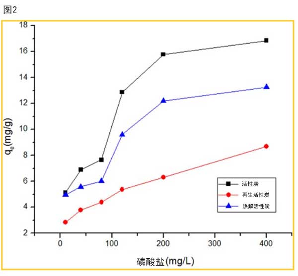 為了評估再生活性炭的性能,研究了磷的吸附性能。在該研究中,通過改變磷酸鹽的初始濃度(20℃)來測試活性炭,再生活性炭和它的吸附容量。圖2顯示了一般趨勢,即吸附容量隨初始P濃度的增加而增加,直至達到飽和狀態。