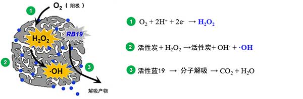 該方法的關鍵特征之一是沒有氧化劑或催化劑外部添加到系統中。過氧化氫電生成和OH生成都發生在負極化的活性炭上。因此,RB19分子,過氧化氫分子和OH自由基處于相同位置(活性炭的孔隙和表面),這有利于短壽命OH的RB19裂解。擴大此流程的關鍵是活性炭與當前不銹鋼網保持良好可靠的聯系。這種方法可以將吸附于活性炭內的分子去除,再生活性炭的吸附能力,是一種比較好的活性炭再生方法。
