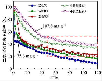 圖2.活性炭和中孔活性炭樣品的SO 2去除效率與時間的關系。