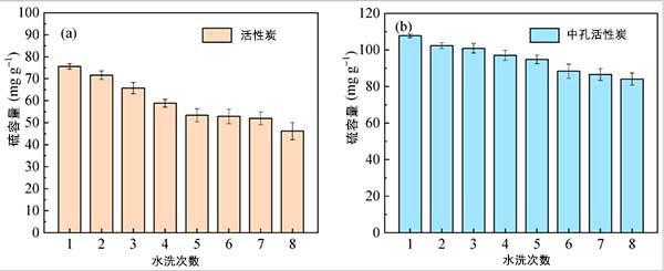 為了比較水洗再生對脫硫后活性炭樣品的影響,研究了硫容量與活性炭和中孔活性炭的循環次數,如圖3所示;钚蕴康墓ぷ髁蛉萘靠傮w呈下降趨勢,第一次脫硫時為75.6 mg·g-1,第8次循環為46.2 mg·g-1,減少率為40.5%,如下圖所示。圖3a。結果表明,飽和吸附劑對H 2 SO 4的不完全解吸對循環SO 2有明顯的負面影響活性炭的吸附性能。用中孔活性炭觀察到類似的結果。然而,中孔活性炭的硫容量在8個循環后降低了22.0%,遠低于微孔活性炭的降低速率,這表明互連微孔和有序介孔的特性促進了H的解吸。2 SO 4并減少硫容量的減少。