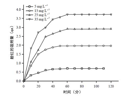 影響酚紅初始濃度的影響:q e(每克吸附劑吸附的酚紅量)(mg g-1)與接觸時(shí)間(min)的關(guān)系,使用不同的初始濃度(5-35mg)在給定的吸附劑量(5g L-1)和pH(2.0)下,L-1的酚紅顯示在圖3中。由于吸附-解吸平衡,每個(gè)圖表顯示吸附隨接觸時(shí)間的初始增加,然后在特征接觸時(shí)間達(dá)到飽和,表明在研究活性炭上酚紅的單層覆蓋。吸附的染料量和達(dá)到吸附平衡所需的時(shí)間隨著底物(染料)初始濃度的增加而增加。很明顯,因?yàn)樵谳^高的染料初始濃度下,活性炭表面上相互作用的吸附分子的數(shù)量變得更高。