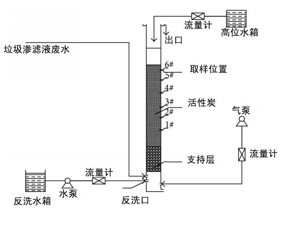 活性炭反應(yīng)器工藝流程圖如圖1所示。活性炭池由有機(jī)玻璃制成,有機(jī)玻璃是柱式反應(yīng)器。活性炭池高度為2米。內(nèi)徑為63毫米。填充高度為1800毫米。碳層高度為1500毫米。砂濾器高度為300毫米。反應(yīng)體積為4.7 L.有5個(gè)水取樣口和碳池。底部有曝氣器,碳池頂部有溢流堰。水質(zhì)分析指標(biāo)為紫外分光光度法和紫外分光光度計(jì)。