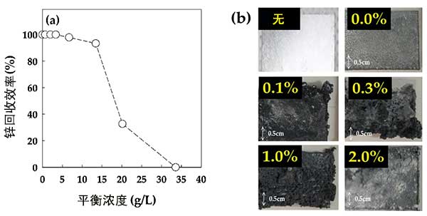 如圖4所示,在吸附物濃度為0.00-0.50%存在下的鋅回收效率至少恢復(fù)99.9%。在超過0.50%的吸附物存在下,鋅回收效率趨于迅速降低。一個(gè)電極的表面由具有不同吸附內(nèi)容物的電解質(zhì)中回收,在沒有吸附物的情況下,電極表面顯示出均勻的沉積。然而,對(duì)于0.1-2%的吸附物,電極表面看起來(lái)非常不均勻地生長(zhǎng)。向電解質(zhì)中添加有機(jī)物改變了金屬沉積物的特征。從顯微鏡分析中,向電解質(zhì)中添加有機(jī)物導(dǎo)致在沉積表面上形成孔。因此,吸附物的存在降低了鋅的回收效率并導(dǎo)致不均勻的沉積。因此,去除吸附物必須小于0.1%。
