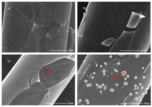 圖1中的FESEM圖像顯示了氧化鈦改性活性炭含銀纖維的表面形態(tài)。在活性炭含銀纖維的表面上觀察到許多納米顆粒,活性炭表面的這些銀納米顆粒被二氧化鈦薄膜包覆,隨著濃度的增加,它們的直徑從約0.2μm急劇增加到1μm。當(dāng)濃度達(dá)到0.4mol/L時,銀納米顆粒不能被二氧化鈦薄膜完全覆蓋。而且,活性炭纖維上的二氧化鈦膜的厚度不均勻。