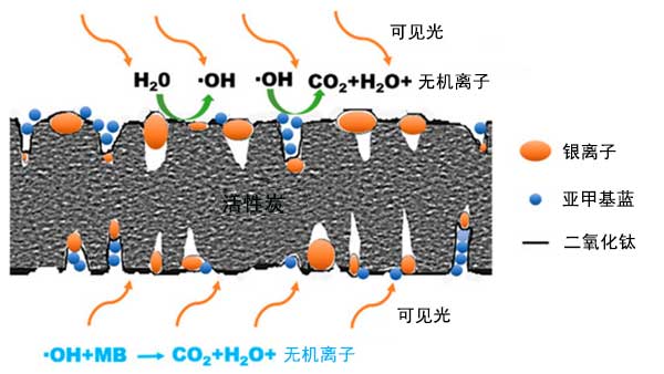 通過光催化降解再生活性炭具有很大的優(yōu)勢,因為與其他再生工藝如熱和化學(xué)處理,微生物再生,電化學(xué)方法和超臨界萃取相比,它具有成本低,二次污染少的特點。此外,光催化再生可以通過同時進(jìn)行光催化降解和吸附來實現(xiàn)活性炭的自再生。二氧化鈦(TiO 2)是一種高效的光催化劑,通常固定在活性炭上進(jìn)行再生。然而,TiO 2的光催化降解部分受到限制,因為它具有兩個固有特性:(1)具有大的帶隙,TiO 2僅吸收UV光子,其僅占太陽光譜中能量的約5% ,(2)由于電荷載體的快速復(fù)合,TiO 2具有低的光催化活性。為了延長光響應(yīng)區(qū)域,貴金屬被摻入TiO 2中,包括金,銀和鉑。與金和鉑相比銀具有抗菌活性和低成本,因此具有更廣泛的應(yīng)用領(lǐng)域。