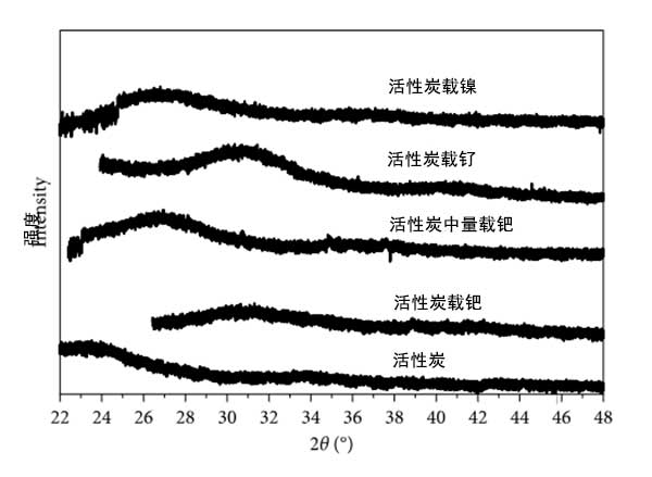 活性炭載三種金屬的衍射圖如圖2所示。在該圖中,可以看出金屬樣品或活性炭沒有確定的信號,這可能表明所有樣品中都沒有結晶相,或晶體非常小(<100)。不存在結晶是由于樣品的低金屬負載量低于X射線衍射設備的檢測極限的結果。